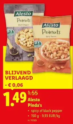 Lidl Alesto Pinda's gezouten geroosterd aanbiedingAlesto Pinda's gezouten geroosterd 250 GLidl€ 0,75€ 0,69€ 0,06 Korting04 februari 202610 februari 2026