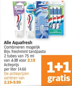 | Alle Aquafresh 75 ml 1+1 gratis | Albert Heijn | € 4,38 | € 2,19 | 1+1 gratis | 24 februari 2025 | 02 maart 2025 | |