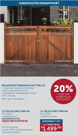 | DRAAIPOORT BANGKIRAI GESLOTEN 100 x 180 cm | Zelfbouwmarkt | € 563,00 | € 449,99 | -20% | 17 oktober 2023 | 13 november 2023 | |