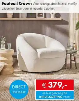 | Fauteuil Crown | Woonsquare | € 379,00 | € 313,22 | € 65,78 Korting | 01 september 2025 | 06 september 2025 | |