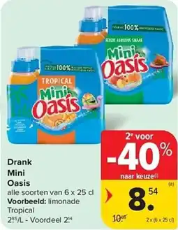 | 2 | Drank Mini Oasis 2 x 6 x 25 cl | Carrefour | € 10,68 | € 8,54 | 2e voor -40% | 11 februari 2026 | 23 februari 2026 | Bekijk aanbieding | |