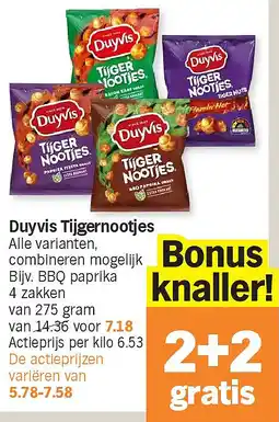 | Duyvis Tijgernootjes bacon cheese 2+2 gratis | Albert Heijn | € 3,59 | 2+2 gratis | 02 februari 2026 | 08 februari 2026 | ||
