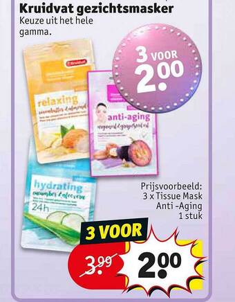 Kruidvat gezichtsmasker aanbiedinggezichtsmaskerKruidvat€ 7,45€ 5,005 voor20 augustus 202425 augustus 2024