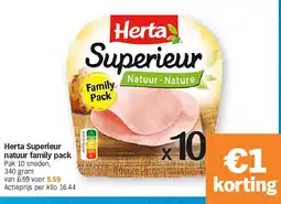 | Herta superieur natuur family pack 340 gram | Albert Heijn | € 6,59 | € 4,99 | € 1,60 Korting | 07 april 2025 | 13 april 2025 | |