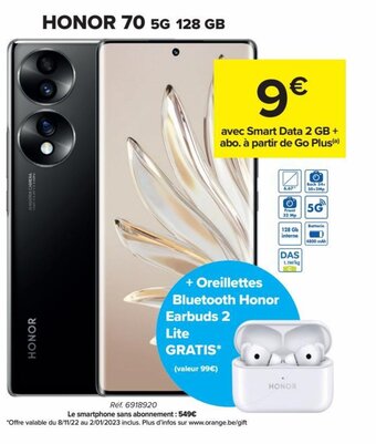 | Honor 70 5G 128GB Ref. 6918920 + gratis bluetooth honor earbuds 2 lite oortjes | Carrefour | € 549,00 | 30 november 2022 | 05 december 2022 |