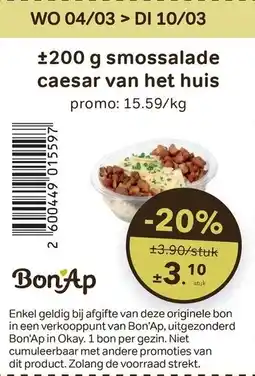 | Smossalade caesar van het huis 200 g | Bon Ap | € 3,90 | € 3,10 | -20% | 04 maart 2026 | 31 maart 2026 | |