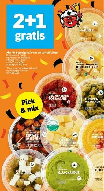 | Olijven met witte kaas | Albert Heijn | € 4,00 | 07 juni 2021 | 13 juni 2021 | |||