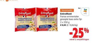 | Entre Mont Franse Emmentaler Geraspte Kaas Extra Fijn 2 x 250g | Colruyt | € 7,69 | 27 juli 2022 | 09 augustus 2022 | |||