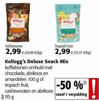 | Kellogg`s deluxe snack mix koffiebonen omhuld met chocolade, abrikoos en amandelen of tropisch fruit, cashewnoten en abrikoos | Colruyt | € 2,99 | 03 juli 2021 | 10 juli 2021 | |||