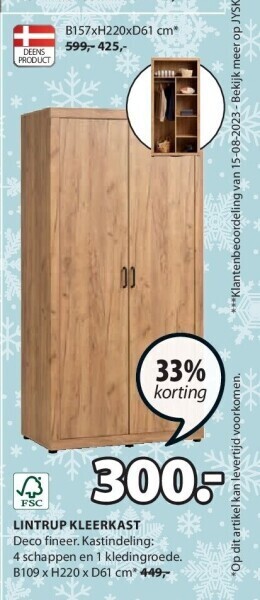| Lintrup kleerkast | Jysk | € 449,00 | € 325,00 | € 124,00 Korting | 28 augustus 2023 | 11 september 2023 | |