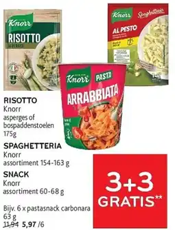 | SPAGHETTERIA Knorr 154-163g of PASTA SNACK Knorr 62-71 g 3+3 GRATIS | Alvo | € 12,54 | € 6,27 | 3+3 GRATIS | 01 november 2023 | 14 november 2023 | |