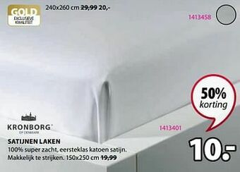 | Kronborg satijnen laken 150x250cm | Jysk | € 26,99 | € 15,00 | 44% korting | 06 maart 2023 | 19 maart 2023 | |