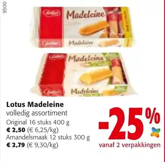 | Lotus Madeleine Original 16 x 25 g | Colruyt | € 2,55 | Combineer naar keuze -25% vanaf 2 verpakkingen | 05 juni 2024 | 18 juni 2024 | ||