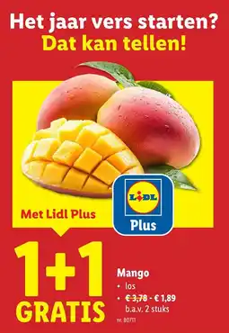 | 4 | Mango los 1+1 gratis | Lidl | € 3,78 | € 1,89 | 1+1 gratis | 29 december 2025 | 03 januari 2026 | Bekijk aanbieding | |