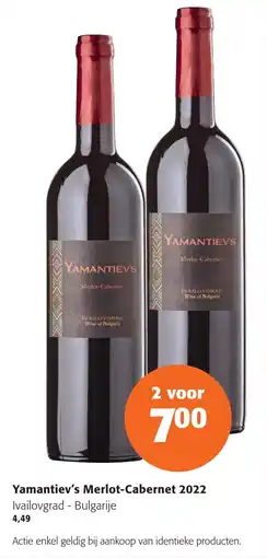 | 1 | Yamantiev’s Merlot-Cabernet 2022 | Colruyt | € 4,49 | 28 januari 2026 | 10 februari 2026 | Bekijk aanbieding | |||