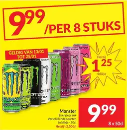 | 1 | Monster energiedrank 8X50 CL | Intermarché | € 9,99 | 13 januari 2026 | 18 januari 2026 | Bekijk aanbieding | |||