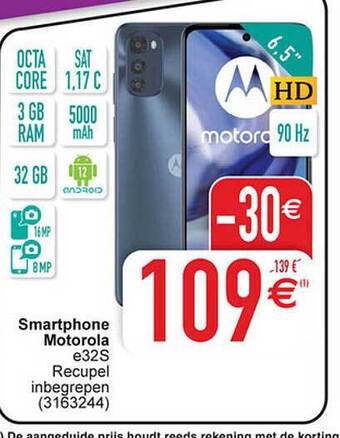 | Motorola smartphone E32S | Cora | € 139,00 | € 109,00 | -30 | 24 januari 2023 | 06 februari 2023 | |