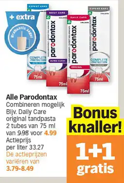 | Alle Parodontax 150 ml 1+1 gratis | Albert Heijn | € 9,98 | € 4,99 | 1+1 gratis | 16 maart 2026 | 22 maart 2026 | |
