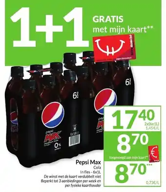 | Pepsi Max 2 x (6x1,5L) 1+1 Gratis | Intermarché | € 21,00 | 1+1 Gratis | 26 oktober 2021 | 01 november 2021 | ||