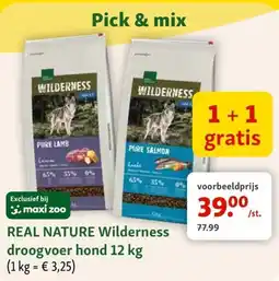 | 1 | Real nature wilderness droogvoer hond 12 kg 1 kg 1+ 1 gratis | Maxi Zoo | € 77,99 | € 39,00 | € 38,99 Korting | 04 maart 2026 | 31 maart 2026 | Bekijk aanbieding | |