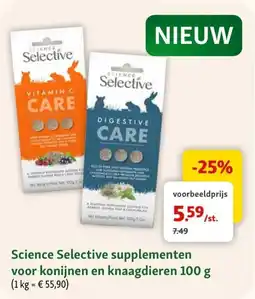 | Science Selective supplementen voor konijnen en knaagdieren 100 G | Maxi Zoo | € 7,49 | € 5,59 | -25% | 07 januari 2026 | 03 februari 2026 | |