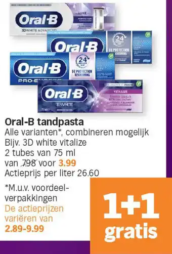 | Oral-b tandpasta 3 tubes van 75 ml 1+2 Gratis | Albert Heijn | € 12,57 | € 4,19 | 1+2 Gratis | 30 mei 2022 | 06 juni 2022 | |