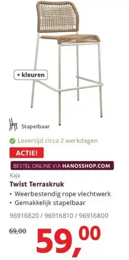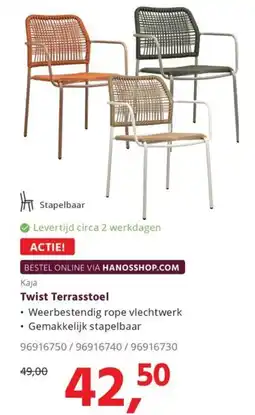 | 1 | Kaja Twist Terrasstoel | Hanos | € 49,00 | € 42,50 | € 6,50 Korting | 05 januari 2026 | 11 januari 2026 | Bekijk aanbieding | |