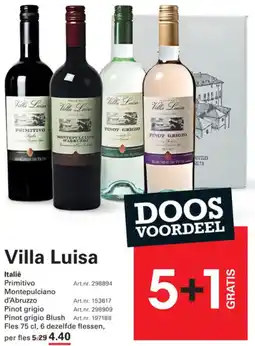 | 1 | Villa Luisa 75 cl 5+1 gratis | Sligro | € 5,29 | € 4,40 | 5+1 gratis | 12 maart 2026 | 04 april 2026 | Bekijk aanbieding | |