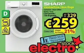 | Sharp wasmachine - lave-linge esha612wd | ElectroStock | € 259,00 | 25 augustus 2021 | 01 september 2021 |