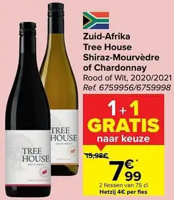 Carrefour Zuid-afrika tree house shiraz-mourvèdre of chardonnay rood of wit, 2020-2021 aanbiedingZuid-afrika tree house shiraz-mourvèdre of chardonnay rood of wit, 2020-2021Carrefour€ 7,9910 maart 202217 maart 2022