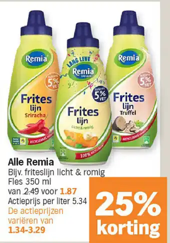 Albert Heijn heeft een ruim assortiment naast de Alle Remia, houd elke week de Albert Heijn folder in de gaten om de beste aanbiedingen en promoties te vinden. Naast Alle Remia in promotie kan u ook volgende aanbiedingen vinden: Remia Friteslijn, Remia Curry saus & Remia Mayolijn 100% plantaardig.