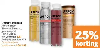 De prijs van Upfront gekoeld kan u vinden bovenaan de pagina, waarbij ook de geldigheidsdata worden genoemd. Daarnaast is de prijs ook te vinden in de huidige Albert Heijn folder of op de website van Albert Heijn. U bent verzekerd van producten aan de laagste prijs bij Albert Heijn als u artikelen in promotie koopt.