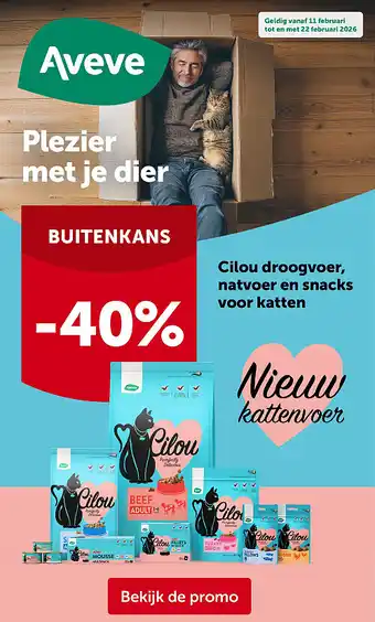 Nu in promo bij AVEVE: Cilou droogvoer, natvoer en snacks voor katten✅ Deze aanbieding is geldig van 11-02 t/m 22-02.