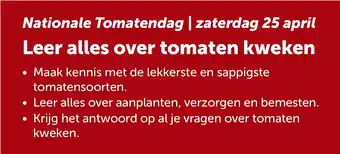 Deze Nationale Tomatendag | zaterdag 25 april Leer alles over tomaten kweken is beschikbaar in onderstaande filialen op basis van jouw ingestelde locatie: