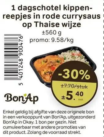 Nu in promo bij Bon Ap: 1 dagschotel kippen reepjes in rode currysaus op thaise wijze✅ Deze aanbieding is geldig van 29-04 t/m 25-05.