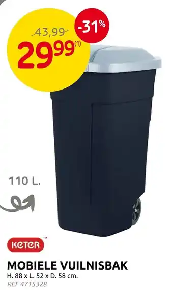 Brico heeft een ruim assortiment naast de Mobiele vuilnisbak, houd elke week de Brico folder in de gaten om de beste aanbiedingen en promoties te vinden. Naast Mobiele vuilnisbak in promotie kan u ook volgende aanbiedingen vinden: Vuilnisbak 50 L, MOBIELE AIRCO & Kis vuilnisbak dual swing.