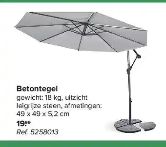Carrefour heeft een ruim assortiment naast de Betontegel, houd elke week de Carrefour folder in de gaten om de beste aanbiedingen en promoties te vinden. Naast Betontegel in promotie kan u ook volgende aanbiedingen vinden: Betontegel 50x50x4,5 cm 0,25m² zwart, aanbieding 2 & aanbieding 3.