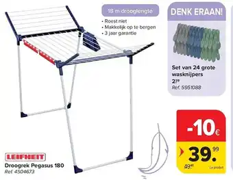 Het is goed dat u tussen de promoties zoekt naar het goedkoopste product dat u nodig hebt! Als u wil weten of Leifheit Droogrek Pegasus 180 de hoogste korting heeft bij Carrefour kan u vergelijken op de Topic pagina of met andere winkels.
