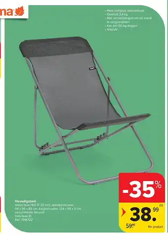 Nu in promo bij Carrefour: Vouwligstoel✅ Deze aanbieding is geldig van 18-03 t/m 4-05.