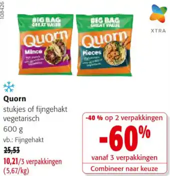 Colruyt heeft een ruim assortiment naast de Quorn, houd elke week de Colruyt folder in de gaten om de beste aanbiedingen en promoties te vinden. Naast Quorn in promotie kan u ook volgende aanbiedingen vinden: Quorn Fijngehakt, Quorn Fijngehakt & Quorn Stukjes of Fijngehakt Vegetarisch.