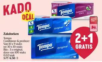 De prijs van Tempo Zakdoeken kan u vinden bovenaan de pagina, waarbij ook de geldigheidsdata worden genoemd. Daarnaast is de prijs ook te vinden in de huidige Delhaize folder of op de website van Delhaize. U bent verzekerd van producten aan de laagste prijs bij Delhaize als u artikelen in promotie koopt.