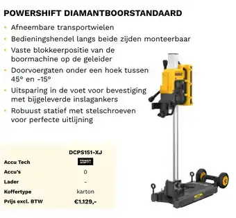 Nu in promo bij DeWALT: Powershift diamantboorstandaard DCPS151-XJ✅ Deze aanbieding is geldig van 1-02 t/m 31-05.