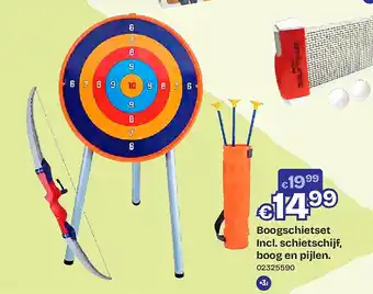 Deze promotie is bij diverse winkels in de aanbieding, bekijk alle producten om te zien welke Boogschietset Incl. schietschijf, boog en pijlen het goedkoopst is.Als u wilt weten of dit product meer korting heeft in een andere winkel kan u vergelijken onder de categorie 'Speelgoed'. Wellicht vindt u deze aanbiedingen ook interessant: Boog, pijlen en doelwit, Buitenkeuken Incl. 27 accessoires & Barbecue Incl. 16 accessoires.