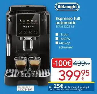 De DeLonghi Espresso full automatic ECAM 220.51.B is momenteel in aanbieding bij Eldi. Op deze pagina vindt u alle informatie over de actuele prijs, promotievoorwaarden en geldigheidsperiode. U kan ook andere acties en vergelijkbare aanbiedingen bekijken, zodat u steeds de voordeligste keuze maakt. De promotie loopt van 01-03-2026 tot en met 31-03-2026. Is de actie afgelopen? Geen probleem – alternatieve DeLonghi Espresso full automatic ECAM 220.51.B promo’s blijven beschikbaar. U kan de productcategorie volgen om automatisch verwittigd te worden wanneer DeLonghi Espresso full automatic ECAM 220.51.B opnieuw in aanbieding komt.Veelgestelde vragen over DeLonghi Espresso full automatic ECAM 220.51.B