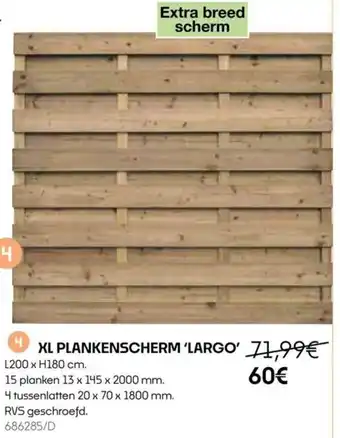 HandyHome heeft een ruim assortiment naast de XL plankenscherm Largo, houd elke week de HandyHome folder in de gaten om de beste aanbiedingen en promoties te vinden. Naast XL plankenscherm Largo in promotie kan u ook volgende aanbiedingen vinden: Scherm Largo, Plankenscherm 'torino' & Plankenscherm 'strato'.
