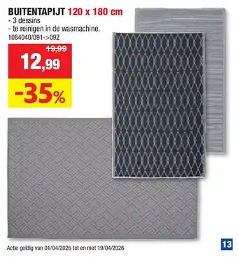 Nu in promo bij Hubo: BUITENTAPIJT 120 x 180 cm✅ Deze aanbieding is geldig van 8-04 t/m 19-04.