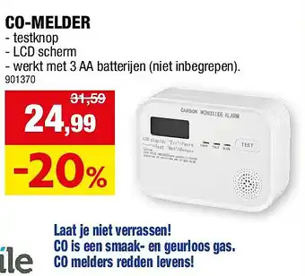 De CO-MELDER is momenteel beschikbaar met korting bij Hubo. Hier vindt u alle details over de actuele prijs, de voorwaarden van de promotie en de geldigheidsduur. Bekijk zeker ook de andere aanbiedingen en acties rond CO-MELDER om zeker te zijn dat u aan de laagste prijs koopt. De promotie loopt van 29-12-2025 tot 11-01-2026. Is de actie intussen verlopen? U vindt steeds andere interessante aanbiedingen en promoties in dezelfde categorie. Door CO-MELDER prijzen en promo’s te vergelijken, bent u zeker dat u nooit te veel betaalt.Veelgestelde vragen over CO-MELDER