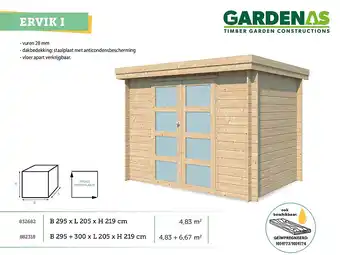 Hubo heeft een ruim assortiment naast de Gardenas Ervik I houten tuinhuis 295x205x219 cm blokhut, houd elke week de Hubo folder in de gaten om de beste aanbiedingen en promoties te vinden. Naast Gardenas Ervik I houten tuinhuis 295x205x219 cm blokhut in promotie kan u ook volgende aanbiedingen vinden: Gardenas Ervik III houten tuinhuis 415x295x219 cm blokhut, Gardenas Ervik IV houten tuinhuis 505x295x219 cm blokhut & Gardenas Lappi I houten tuinhuis 205x175x191 cm blokhut.