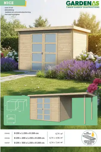 Hubo heeft een ruim assortiment naast de Nice, houd elke week de Hubo magazine in de gaten om de beste aanbiedingen en promoties te vinden. Naast Nice in promotie kan u ook volgende aanbiedingen vinden: Gardenas Nice houten tuinhuis 295x250x208 cm blokhut, aanbieding 2 & aanbieding 3.