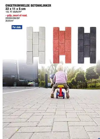 De ONGETROMMELDE BETONKLINKER 22 x 11 x 5 cm is momenteel in aanbieding bij Hubo. Op deze pagina vindt u alle informatie over de actuele prijs, promotievoorwaarden en geldigheidsperiode. U kan ook andere acties en vergelijkbare aanbiedingen bekijken, zodat u steeds de voordeligste keuze maakt. De promotie loopt van 21-03-2026 tot en met 10-05-2026. Is de actie afgelopen? Geen probleem – alternatieve ONGETROMMELDE BETONKLINKER 22 x 11 x 5 cm promo’s blijven beschikbaar. U kan de productcategorie volgen om automatisch verwittigd te worden wanneer ONGETROMMELDE BETONKLINKER 22 x 11 x 5 cm opnieuw in aanbieding komt.Veelgestelde vragen over ONGETROMMELDE BETONKLINKER 22 x 11 x 5 cm